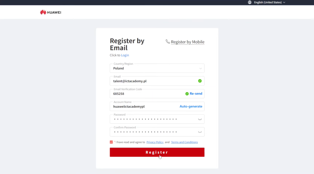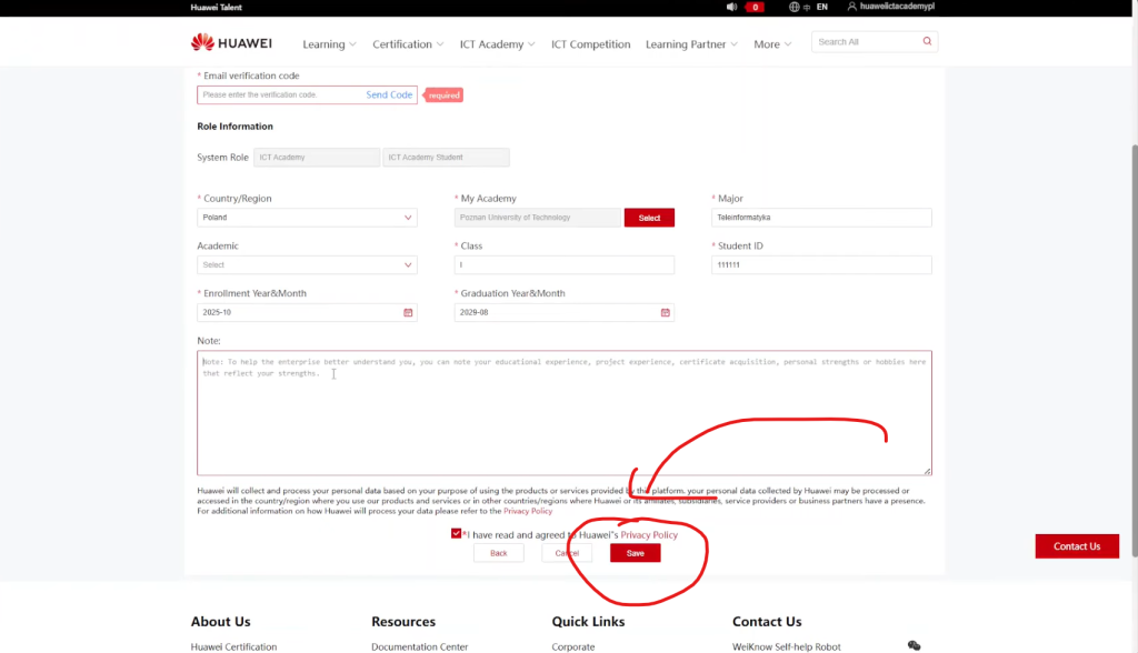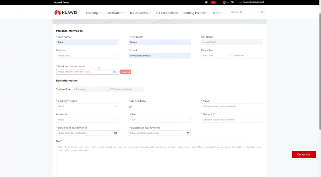 To bardzo proste! Aby dołączyć do Huawei ICT Academy PP, należy założyć konto na platformie Huawei Talent. W razie potrzeby, na samym dole tej strony znajduje się film instruktażowy, który pomoże Ci w rejestracji.